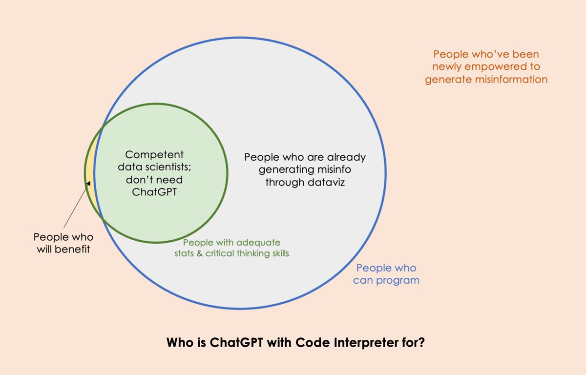 random_walker ChatGPT with Code Interpreter is like Jupyter Notebook for non-programmers. That's cool! But how many non-programmers have enough data science training to avoid shooting themselves in the foot? Far more people will probably end up misusing it. pic.twitter.com/IZJW4z15Tl