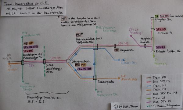 BVG_Tram M5/M6/M8/27: wegen einer Havarie und Bauarbeiten verkehren die Linien ab morgen verändert (prov. Übersicht) #BVG pic.twitter.com/uZcekJE4MO