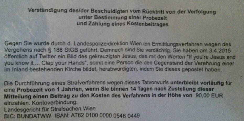 emil_goldberg Jesus-Witz kostet 90€ "Kostenbeitrag" und ich muss jetzt ein Jahr lang brav sein. Na gut. Trotzdem eine Farce. pic.twitter.com/yo2chCbuxo
