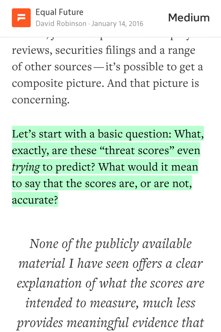 dgrobinson The police may think you have a high “threat score.” What does that mean? My take: medium.com/equal-future/b… pic.twitter.com/ZDHojBUCR7