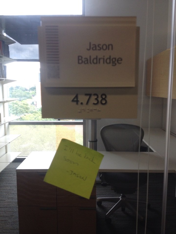 jasonbaldridge And who knows... Maybe the old sticky note I used when I had to pop out for a minute is a longer term message... pic.twitter.com/1txeBCXPMM