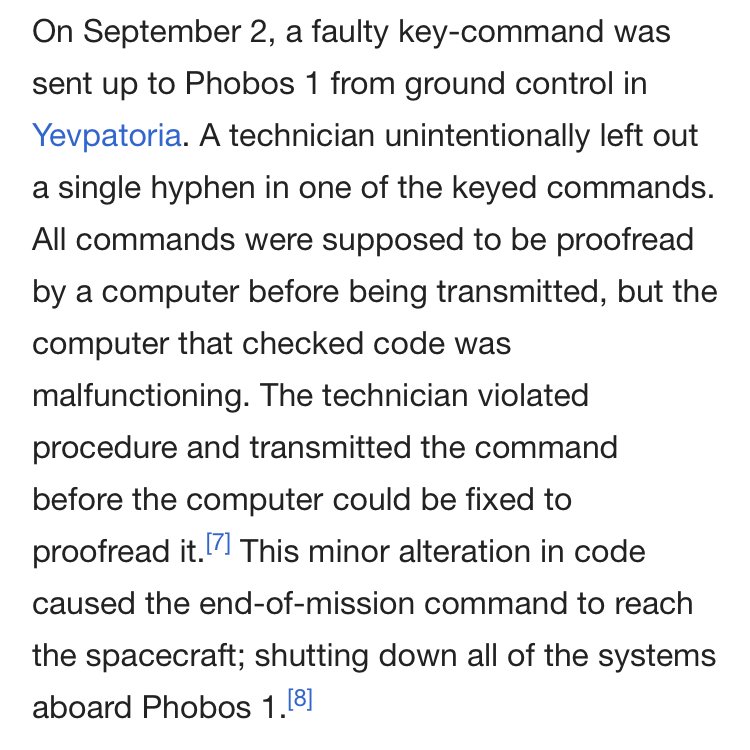 In 1988 a Russian technician missed a single hyphen in his code, transmitted it without checking, and thus instantly and irreversibly bricked a 6,200 kg spacecraft en route to Mars.