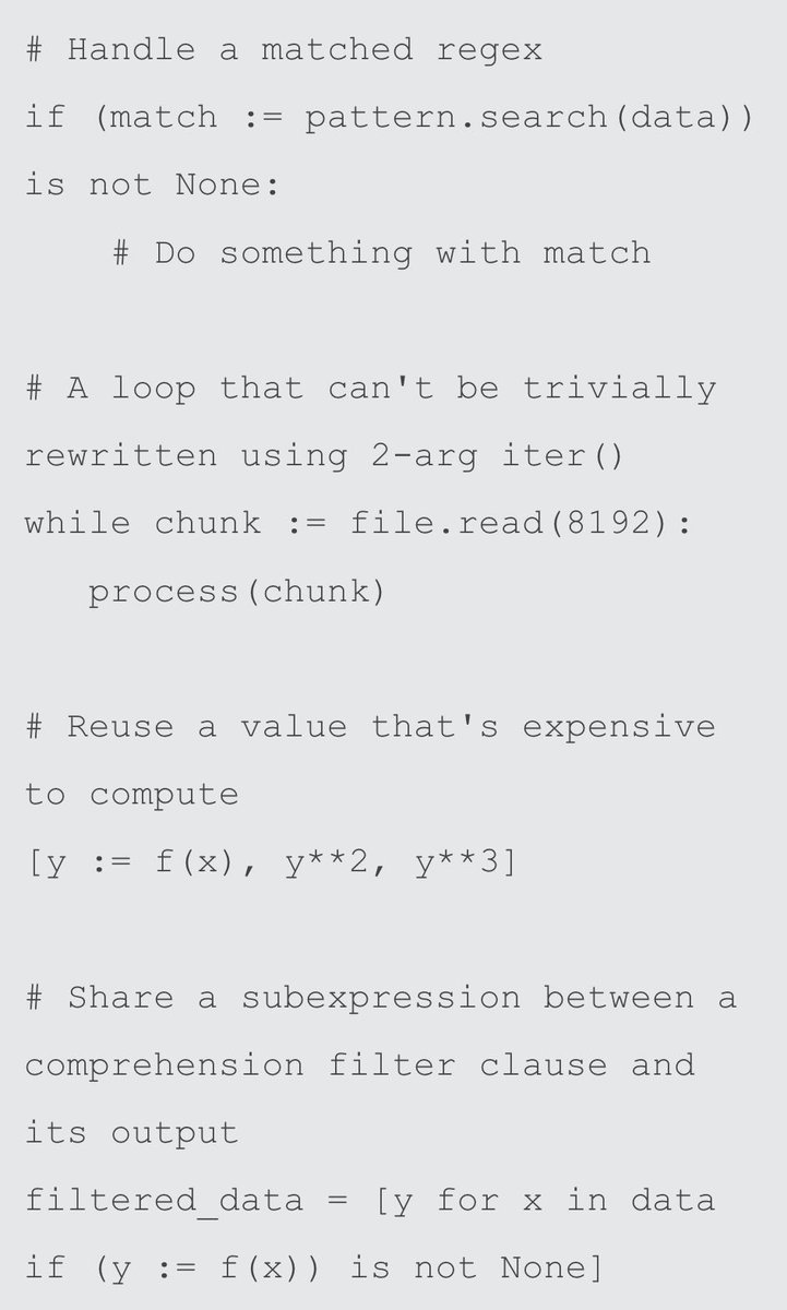 simonw I really like these examples of uses for the new Python 3.8 walrus operator python.org/dev/peps/pep-0… pic.twitter.com/m1cShMRZ3m