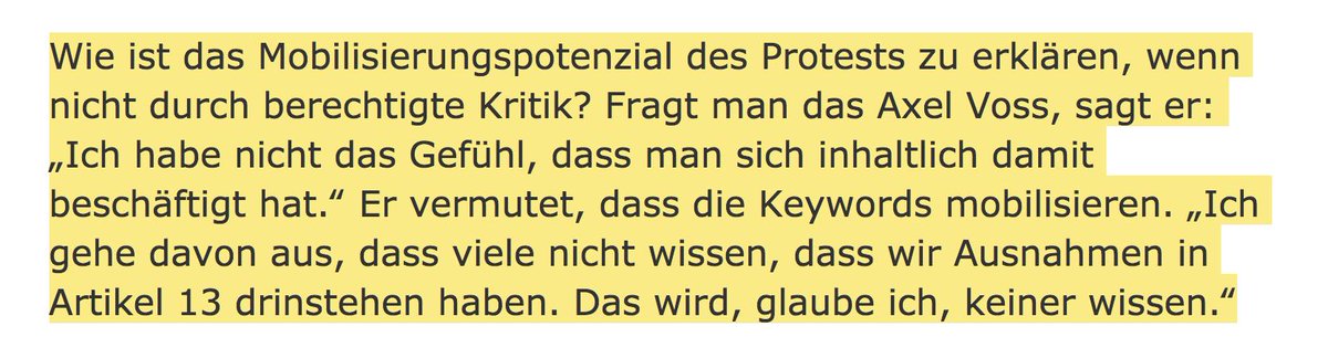reinboth Was gar nicht geht ist, dass die @CDU_CSU_EP gegen den Rat sämtlicher Expert*innen und aller Digitalpolitiker*innen von #CDU und #CSU, gegen die #JU und gegen das @c_netz schlechte #Politik macht - und dann auch noch Solidarität einfordert und sich Kritik verbittet... #Artikel13 twitter.com/CSU/status/111…