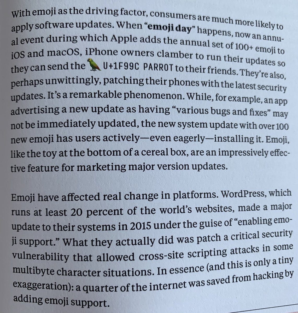 eugenewei “In essence (and this is only a tiny exaggeration): a quarter of the Internet was saved from hacking by adding emoji support.” pic.twitter.com/bwA2Da9Hcb