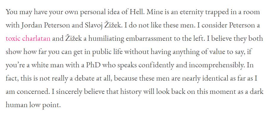 Johannes42 Die bekloppte Debatte zwischen Žižek und Peterson habe ich mir natürlich nicht angesehen, aber diesen lustigen Text dazu haben ich gerne gelesen: