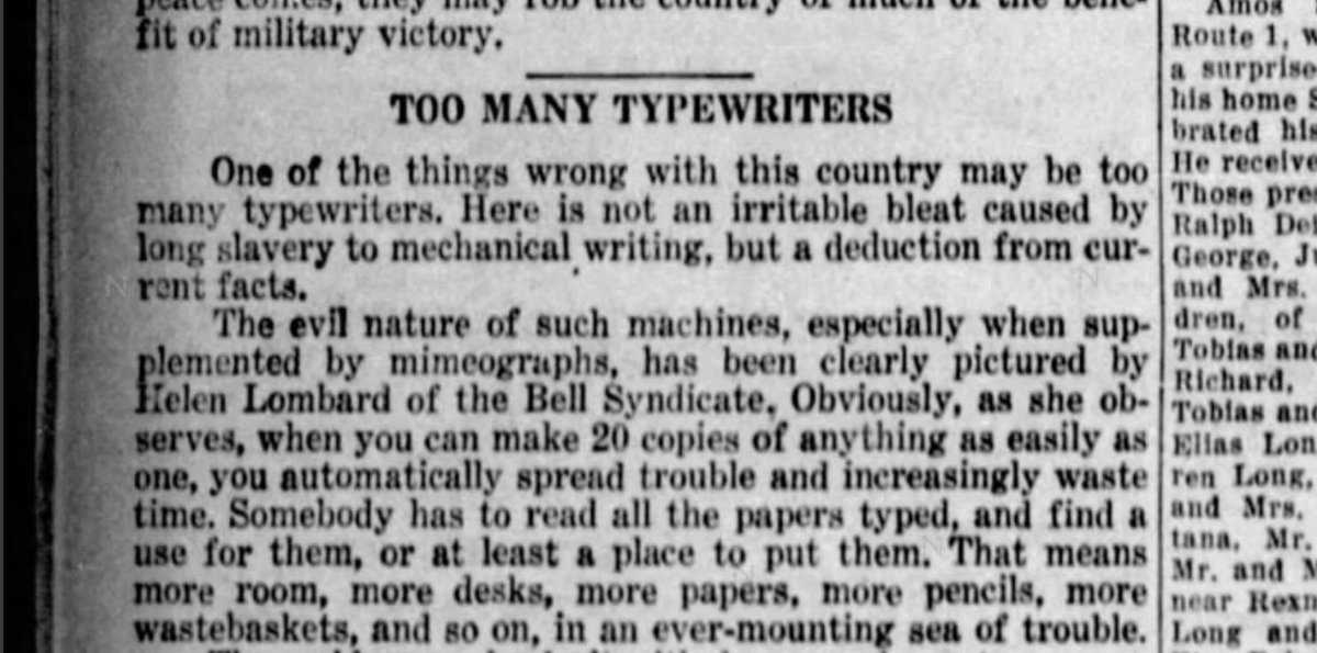 PessimistsArc “When you can make 20 copies of anything as easily as one, you automatically spread trouble and increasingly waste time” (1942) newspapers.com/clip/32988004/ pic.twitter.com/OtTzMyr8RD