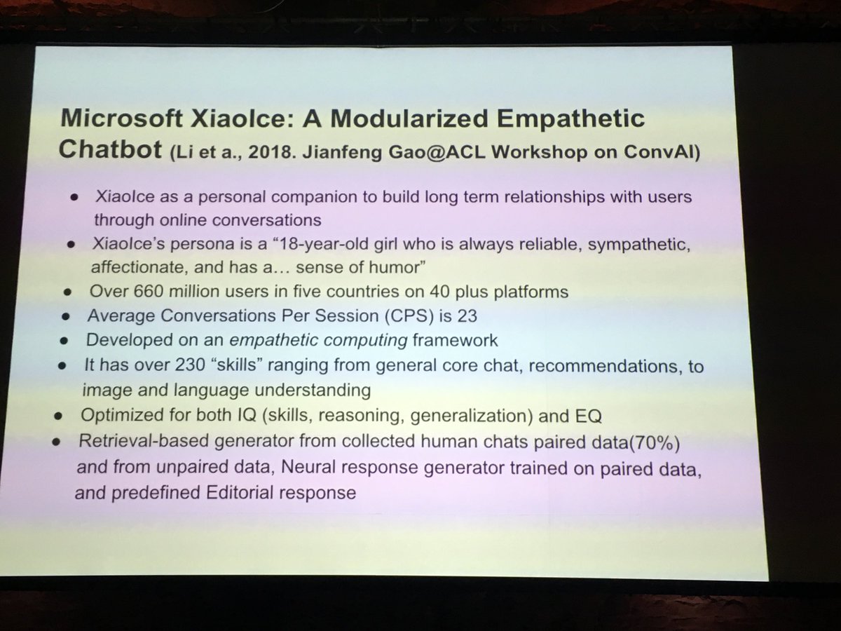 emilymbender “Persona of an 18 year old girl”: why do chatbots need an age and gender? Why specifically that choice? This seems like the wrong direction for framing synthetic empathy. #ethnlp slide from Fung’s #acl2019nlp keynote pic.twitter.com/fJh0L6yfJc