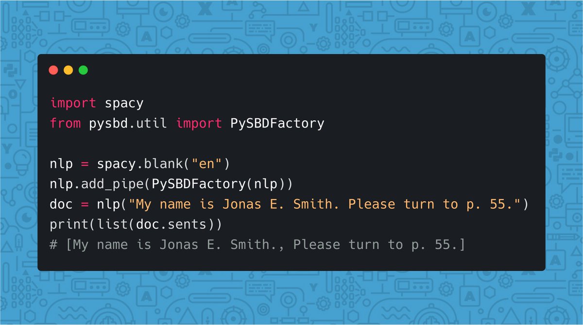 spacy_io 🐍💯 pySBD by by @NipunSadvilkar: A rule-based, "real-world" sentence segmenter which extracts reasonable sentences when the format and domain of the input text are unknown. Ported from the Pragmatic Segmenter Ruby gem & also supports standalone use.