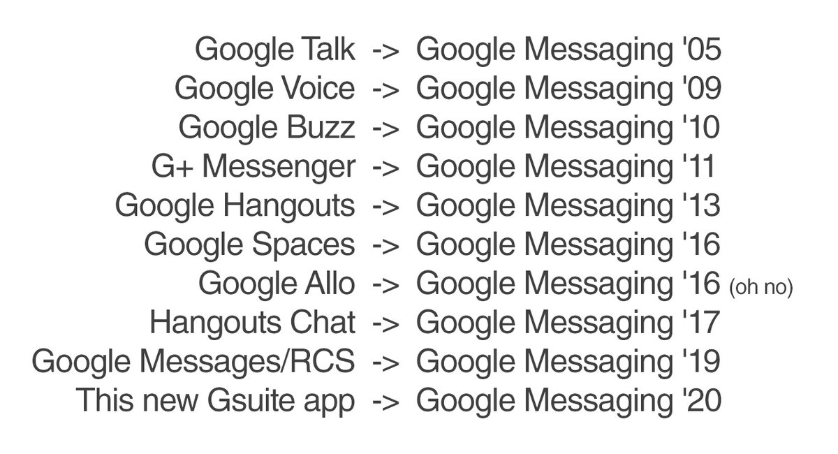 RonAmadeo I propose we rename Google messaging services with the year of release, just like a copy of Madden or FIFA.