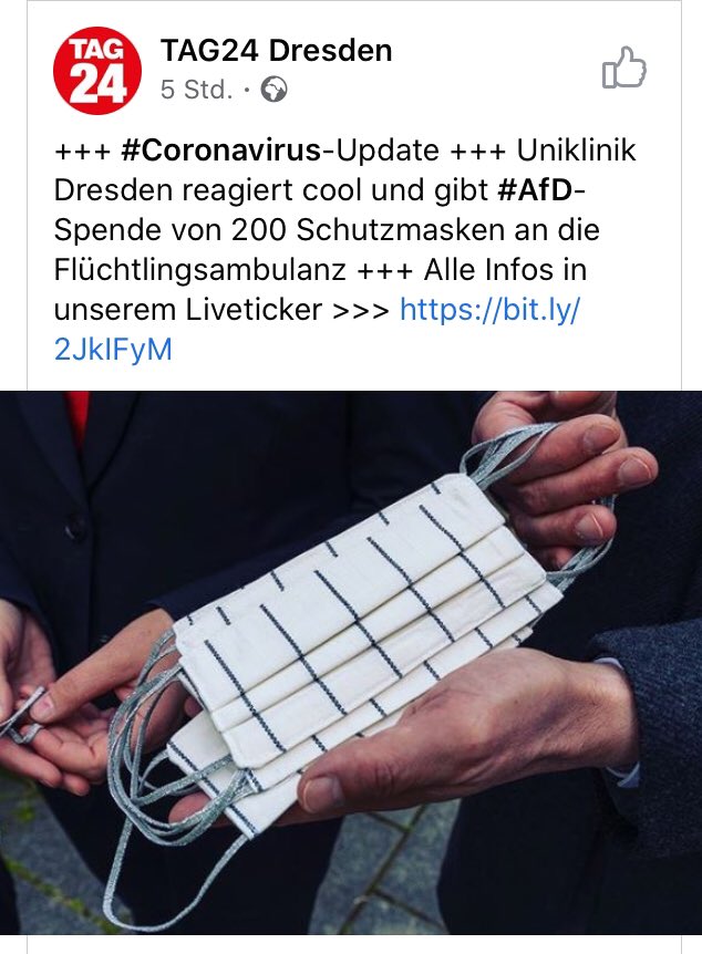 Uniklinik Dresden gibt #AfD-Spende von 200 Schutzmasken an die Flüchtlingsambulanz pic.twitter.com/nh429fuVq6