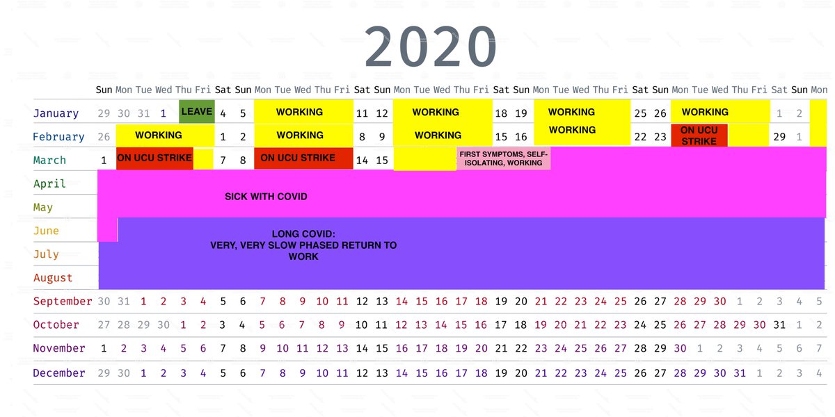 With 2/3 of the yr gone, here's my 2020 calendar of...err...non-work & illness. I haven't marked the 8 occasions (each one of them precious) since 19 March I've made it more than 1 mile from my house pic.twitter.com/2oo0itPEqM
