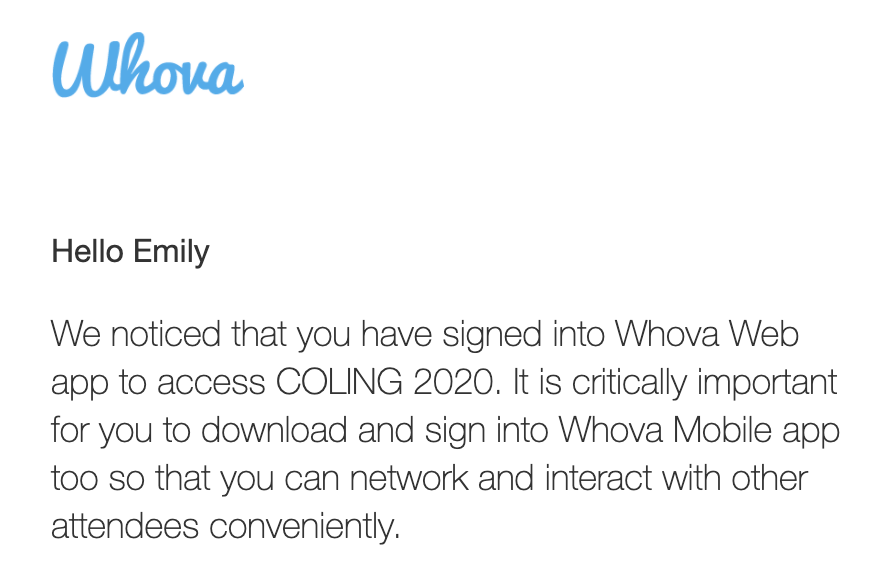 emilymbender Hey @WhovaSupport no one needs to use the damn mobile app when we're all attending from our homes, TVYM. (I realize this is an automated message, but maybe by Dec 2020 it could have been removed?) #Coling2020 pic.twitter.com/hzVqRWZKjn