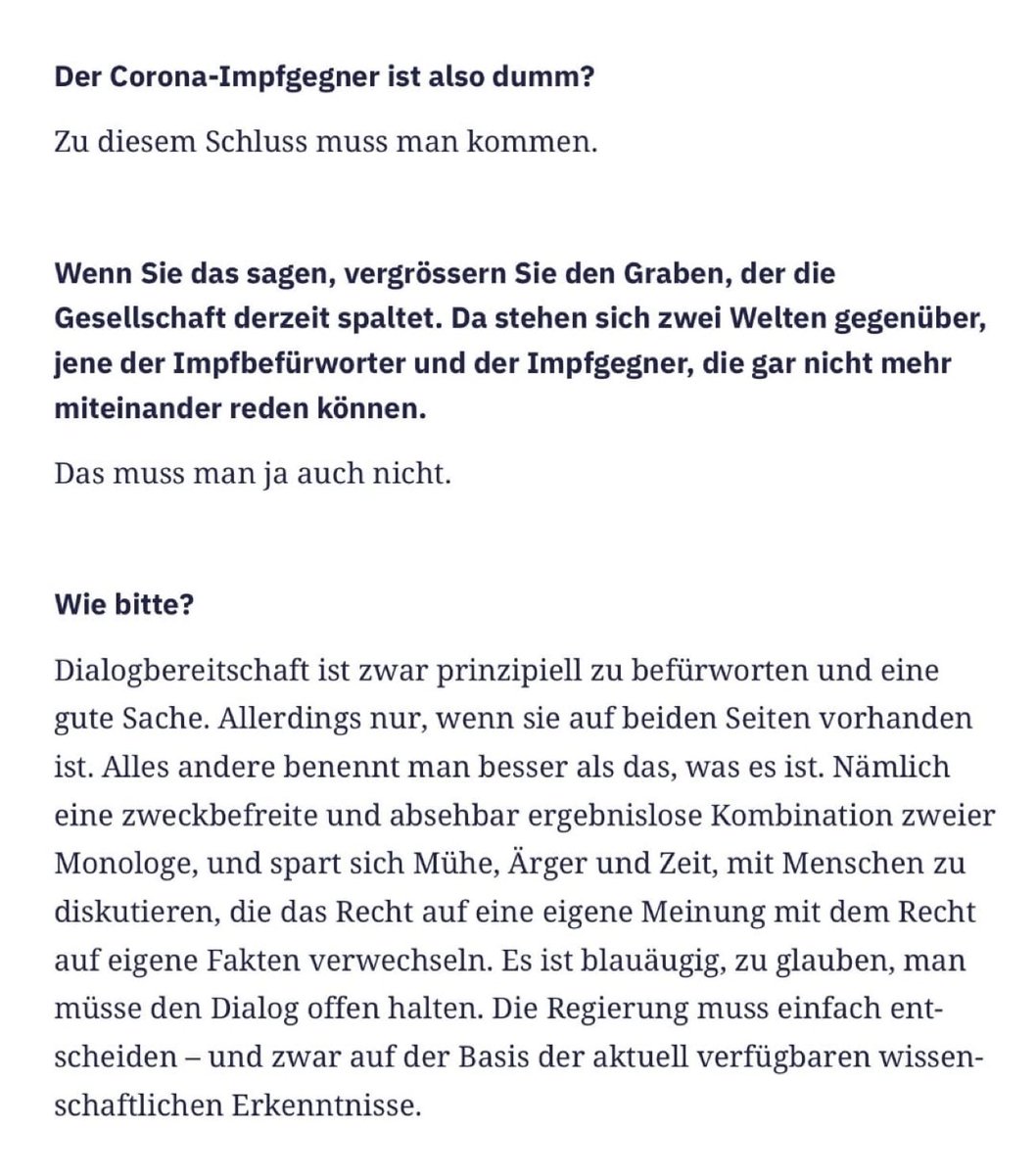 derwahremawa Es wäre halt unschick, zur Kenntnis nehmen zu müssen, dass man selber halt gar nicht kategorial besser ist als z.B. ein leberkäsfutternder pensionierter Briefträger, der brav geimpft und mit einem frisch gebraucht gekauften Smartphone (wegen der Warn-App!) auf der Couch sitzt