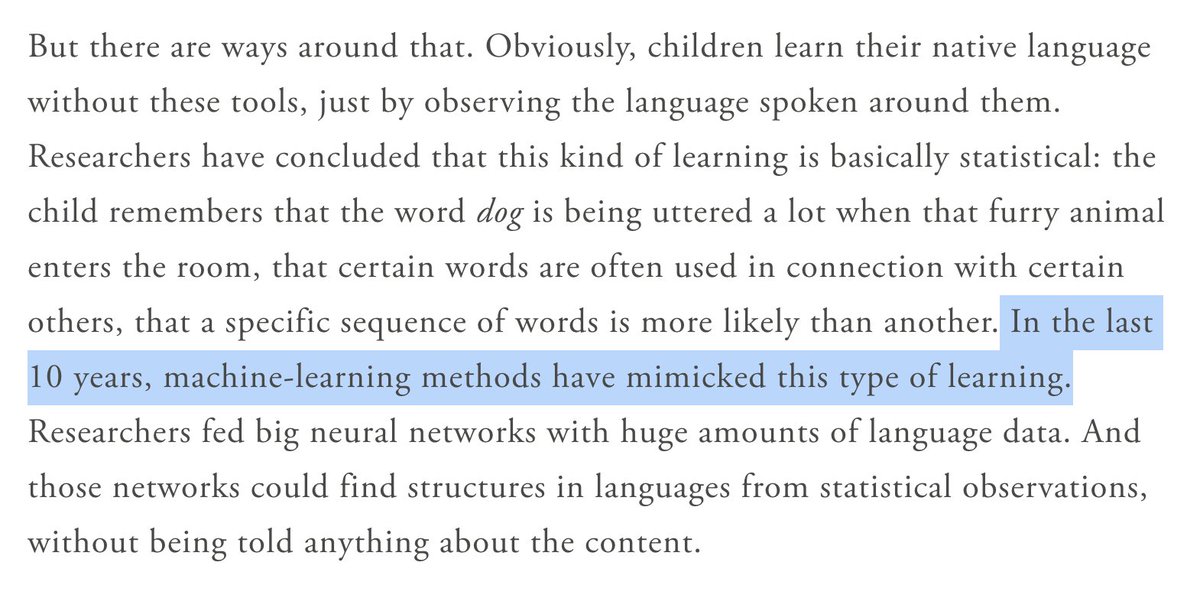 emilymbender Once again, #NLProc folks: Stop telling journalists that ML learns 'like children do'.