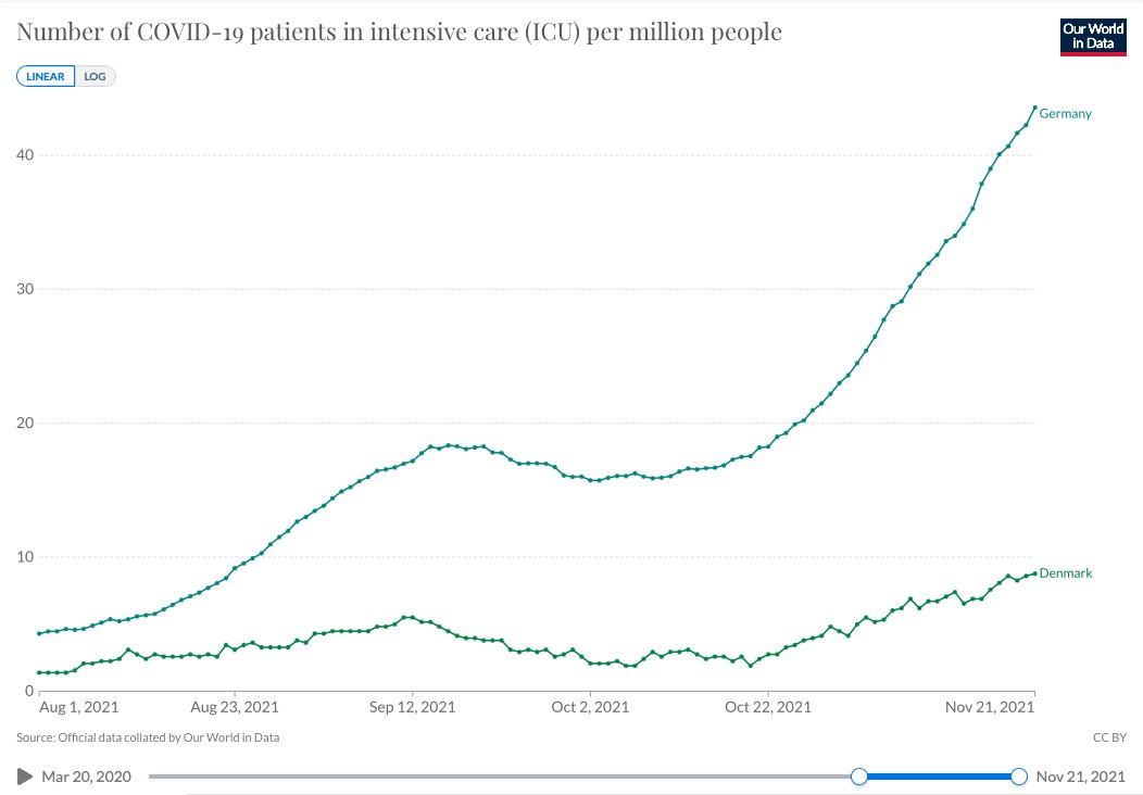 m_grill Impfsekptiker rufen zur Zeit gerne "Dänemark"! Weil Dänemark eine deutlich höhere Impfquote hat als DEU, die Fälle aber dennoch explodieren. Die Unterstellung ist: Impfung nützt eigentlich nichts.