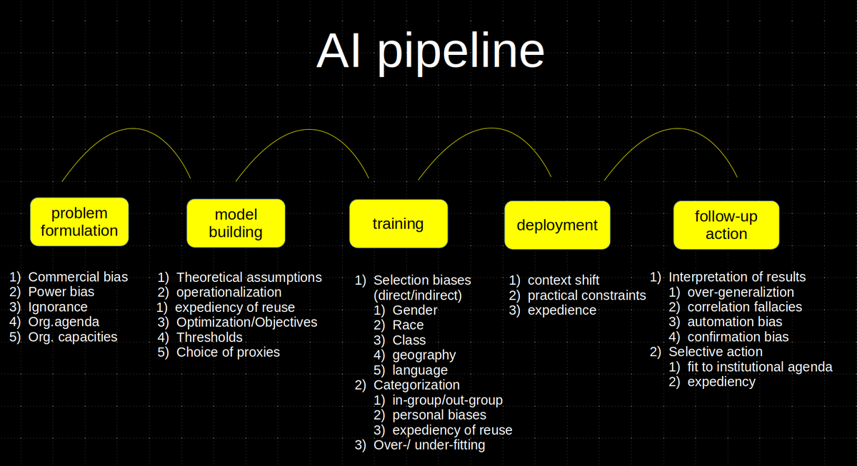 stalfel As part of a course I'm teaching (to art and comp-sci students), I prepared this slide from hell on bias across the AI pipeline (to expand the focus beyond bias in data). I'm sure its far from complete. pic.twitter.com/9OfIkBlku3