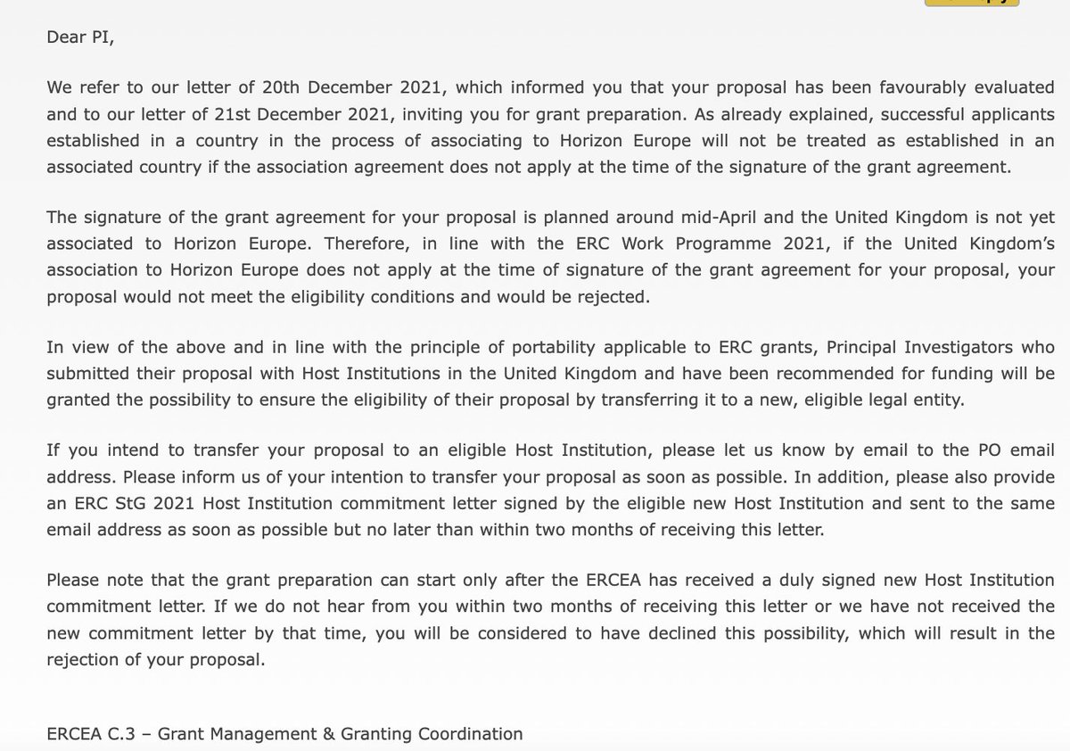 fetzert And here it is -- communication from @ERC_Research to UK-based #ERC starting grant grantees... UK awardees will have two months time to move their grant to the EU proper, otherwise they will lose their STG. Thank you #Brexit #BrexitReality. pic.twitter.com/AnJeCrCQrZ