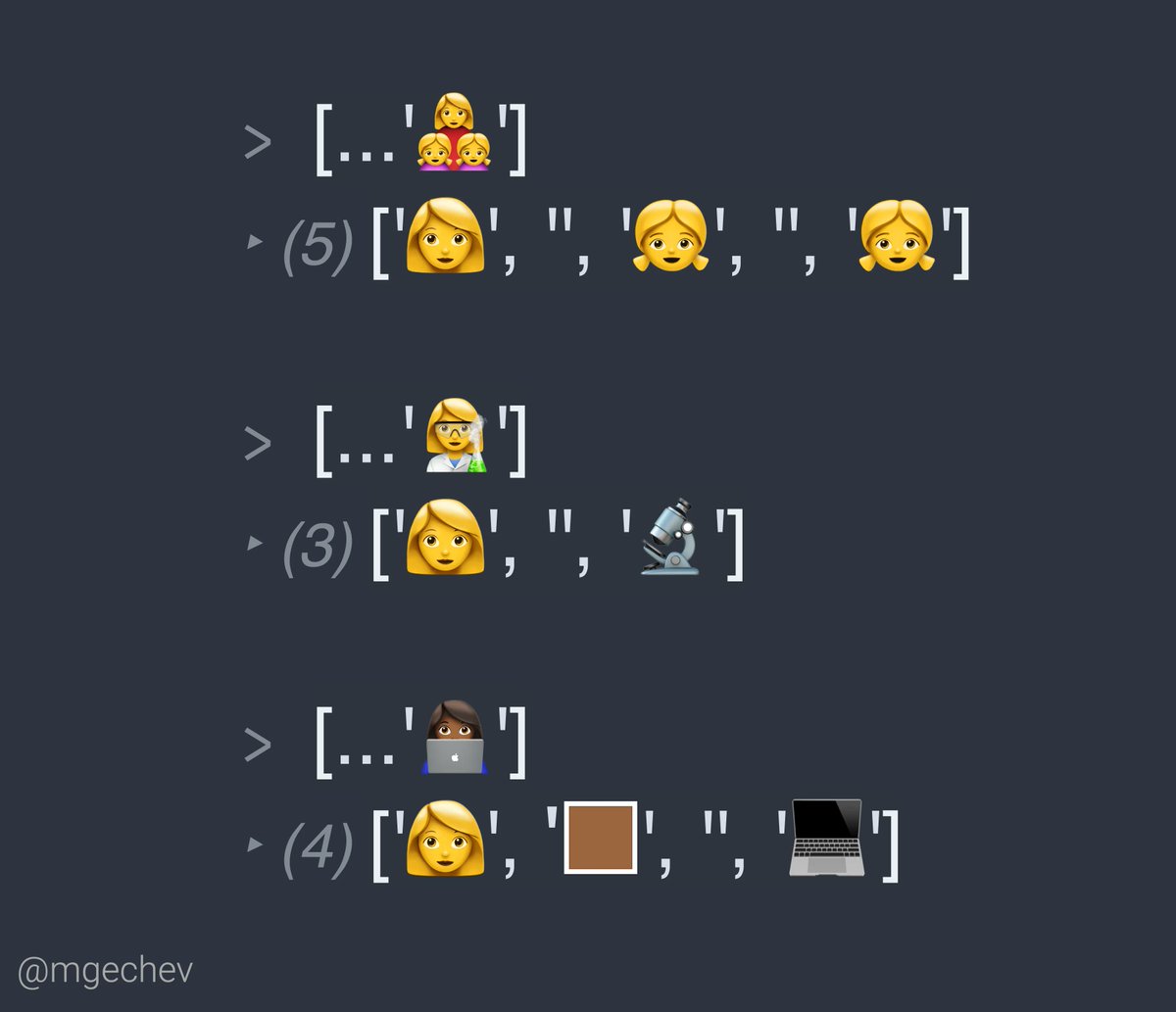 mgechev In JavaScript you can use the spread syntax to find what an emoji is made up of ✨ pic.twitter.com/0VCvFmJQnv