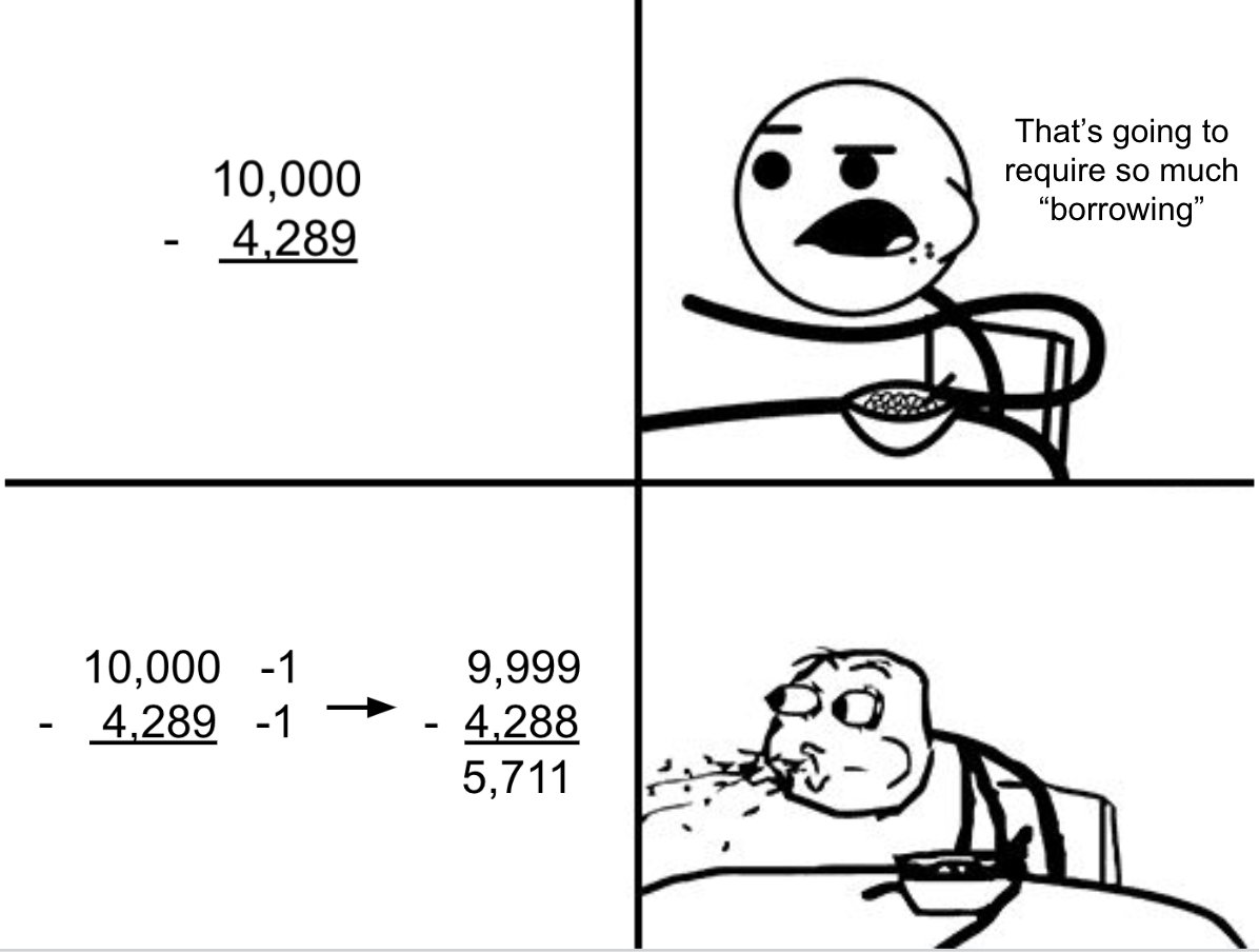 howie_hua If you're subtracting from a number with a lot of 0s, subtract one from both numbers so you don't have to "borrow." pic.twitter.com/WzZPNMJuUM